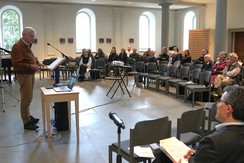 Die dritte Sektion nahm Klostermusik als Forschungsgegenstand in den Blick. Mit dem ersten Vortrag stand zunächst wieder St. Gallen im Fokus. Dr. Michael Wersin berichtete von der Tätigkeit der St. Galler Praxis- und Koordinationsstelle Gregorianischer Choral, die sich die Pflege und Vermittlung des St. Galler Chorals zum Ziel gesetzt hat. Im darauffolgenden Vortrag befasste sich Dr. Gottfried Heinz-Kronberger mit der Erschließung von Musikalien aus Klosterbeständen. Im Rahmen des länderübergreifenden Forschungsprojekts Répertoire International des Sources Musicales (RISM) stellte der Referent das Erfassungsprozedere von Musikhandschriften aus Klosterbeständen des süddeutschen Raumes vor. Die erste Sektionshälfte beschloss eine halbstündige Chorprobe eines Ad-hoc-Chors aus Teilnehmenden unter Leitung von Dr. Michael Wersin, der zwei St. Galler Choralstücke einstudierte. Nach dieser musikalischen Einlage folgten zwei Vorträge, die sich mit der Hörbarmachung bzw. Sichtbarmachung von Musik mit Hilfe modernster Technik befassten. Prof. Dr. Stefan Morent stellte das Forschungsprojekt Sacred Sound – Sacred Space vor, das sich mit der Auralisation von liturgischen Gesängen in einem heute nicht mehr existierenden sakralen Raum (Cluny III) befasst. Dr. Andreas Janke beschloss die dritte Sektion mit einem Vortrag, der die Möglichkeiten und Grenzen der multispektralen Bildanalyse erläuterte, mit deren Hilfe der Schreibprozess und ggf. die Umnutzung einer Musikhandschrift sichtbar gemacht und damit rekonstruiert werden können.