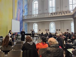 Im vielbesuchten öffentlichen Abendvortrag sprach Dr. FRANZISKA SCHNOOR über den St. Galler Mönch Valentin Molitor (1637–1713) und die barocke Musikpraxis im Kloster St. Gallen. Mit seiner Hinwendung zur Mehrstimmigkeit und Instrumentalmusik steht er am Anfang der barocken Musikpraxis seines Klosters. Ihm folgten unter den St. Galler Mönchen weitere Komponisten, deren Namen heute aber weitgehend vergessen sind. Der Vortrag wurde musikalisch umrahmt durch das Vokalensemble APOLLON und ein Barockorchester. Unter der Leitung von RAPHAEL HOLENSTEIN wurden drei Marien-Motteten von Valentin Molitor aufgeführt. Wort und Klang gingen an diesem Abend eine anregende und stimmungsvolle Symbiose ein.